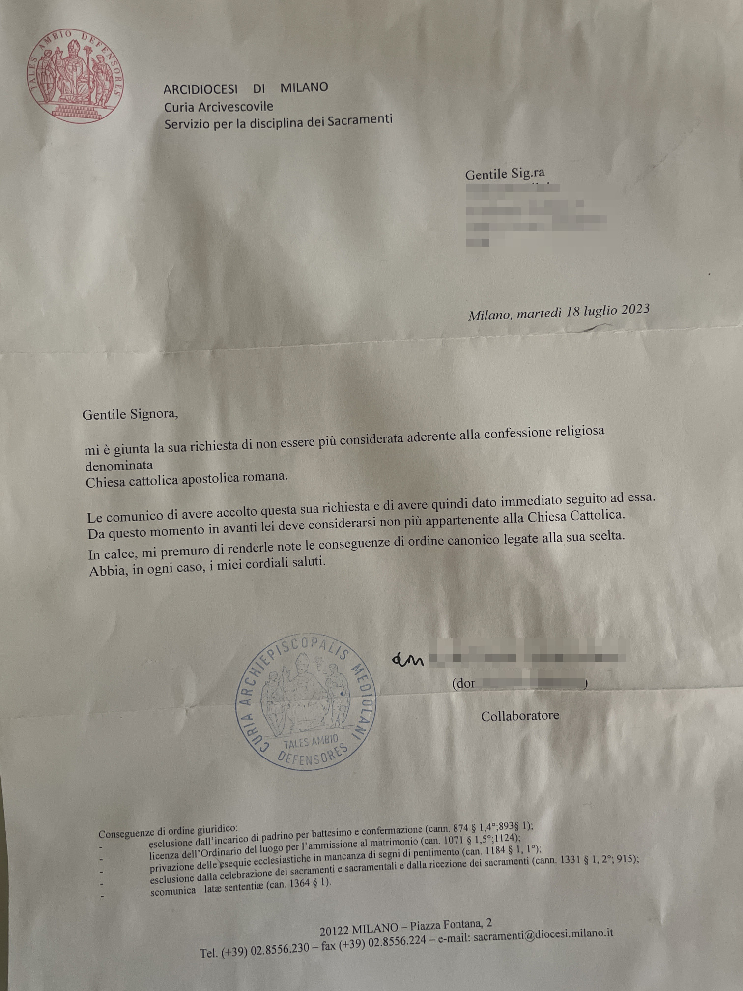 Una persona ha chiesto la rettifica dei dati relativi al proprio battesimo avvenuto a Maria Regina - VAREDO (MB) il 18/07/2023, dichiarando di non voler più far parte della Chiesa Cattolica.
