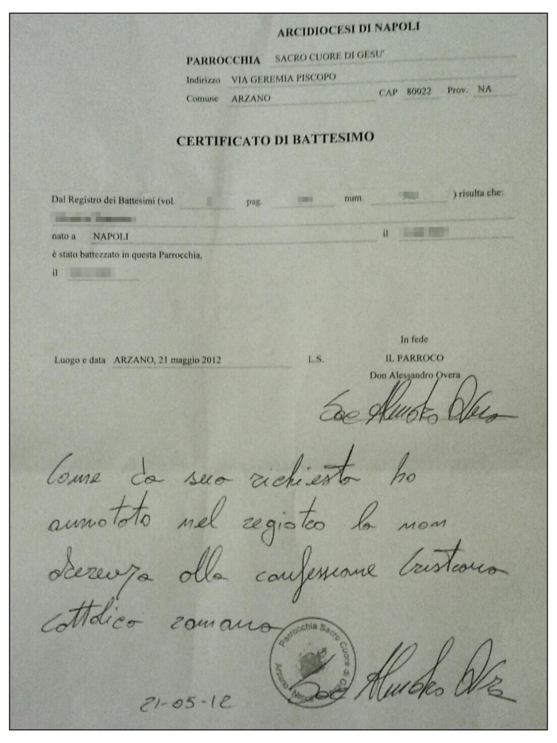 Una persona ha chiesto la rettifica dei dati relativi al proprio battesimo avvenuto a Sacro Cuore di Gesù - ARZANO (NA) il 21/05/2012, dichiarando di non voler più far parte della Chiesa Cattolica.