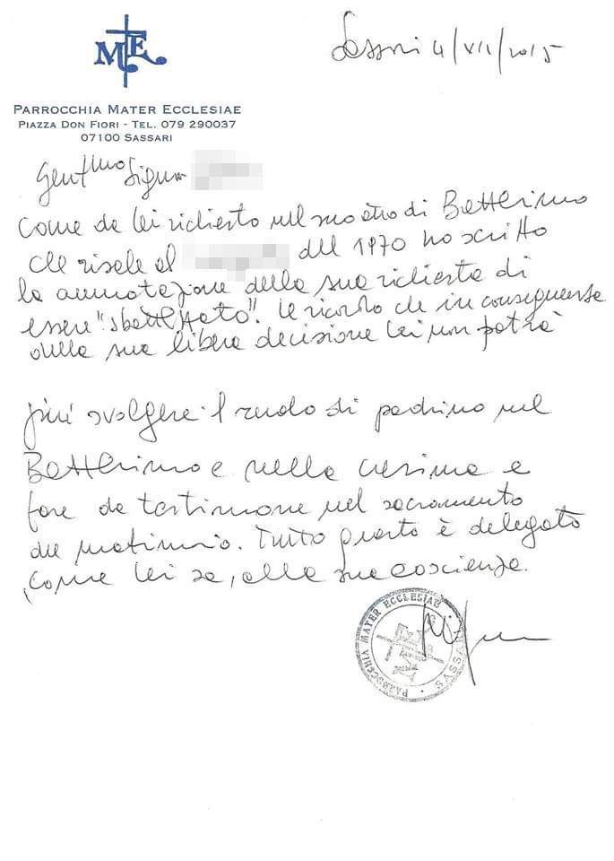 Una persona ha chiesto la rettifica dei dati relativi al proprio battesimo avvenuto a Beata Vergine Maria Madre della Chiesa - SASSARI (SS) il 04/12/2015, dichiarando di non voler più far parte della Chiesa Cattolica.