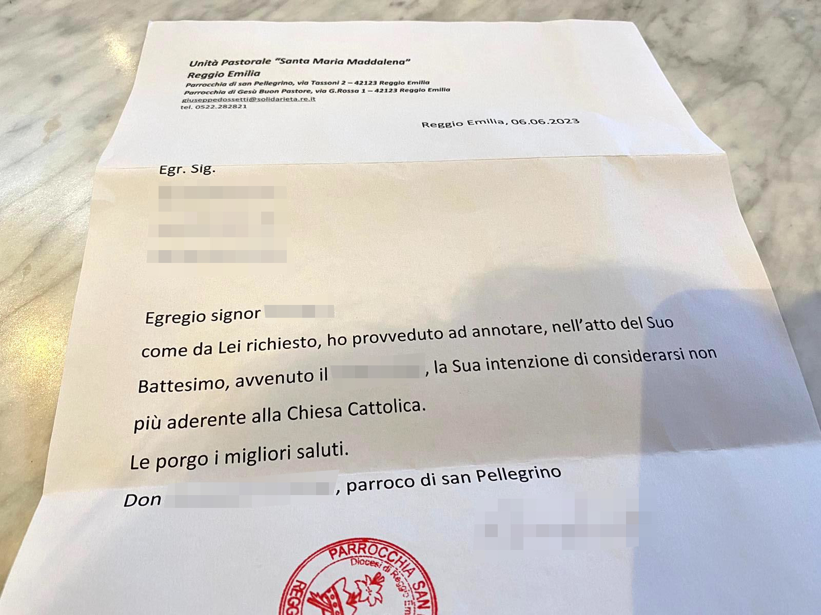 Una persona ha chiesto la rettifica dei dati relativi al proprio battesimo avvenuto a S. Pellegrino C. - REGGIO NELL'EMILIA (RE) il 06/06/2023, dichiarando di non voler più far parte della Chiesa Cattolica.