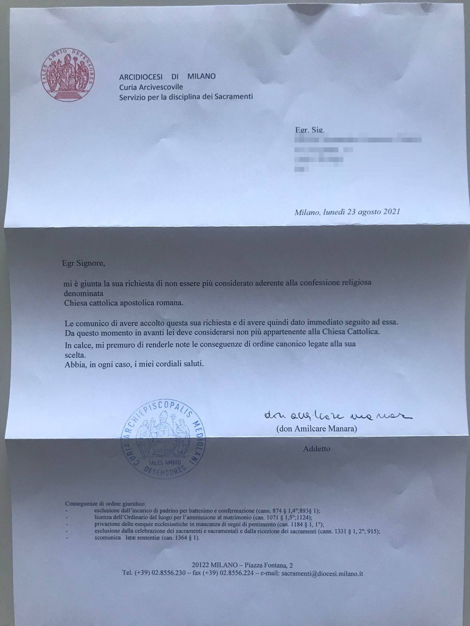Ho scritto una mail alla parrocchia del paese in cui ho ricevuto il battesimo e non ho ottenuto risposta. Ho mandato quindi la raccomandata col modulo UAAR e la fotocopia dei miei documenti per sollecitare ma, praticamente poche ore dopo l'invio, mi è arrivata una mail dalla diocesi di Milano in cui mi si chiedevano documenti e indirizzo per inviarmi la conferma della procedura. Devo riconoscere che sono stati molto gentili e collaborativi. Tra tutto ci son voluti quasi tre mesi per ricevere la lettera di avvenuto sbattezzo ma forse è dipeso anche dal periodo estivo. Fatto sta che ci sono riuscito. Chiunque volesse fare altrettanto ed è stato battezzato a Milano o nel milanese può mandare una mail col proprio documento e indirizzo postale a sacramenti@diocesi.milano.it.