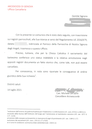 Una persona ha chiesto la rettifica dei dati relativi al proprio battesimo avvenuto a Nostra Signora Degli Angeli - GENOVA (GE) il 14/07/2021, dichiarando di non voler più far parte della Chiesa Cattolica.