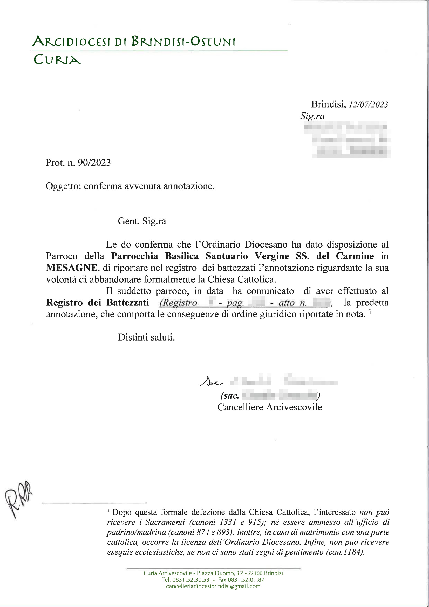 Una persona ha chiesto la rettifica dei dati relativi al proprio battesimo avvenuto a Vergine Ss. del Carmelo - MESAGNE (BR) il 10/10/2023, dichiarando di non voler più far parte della Chiesa Cattolica.