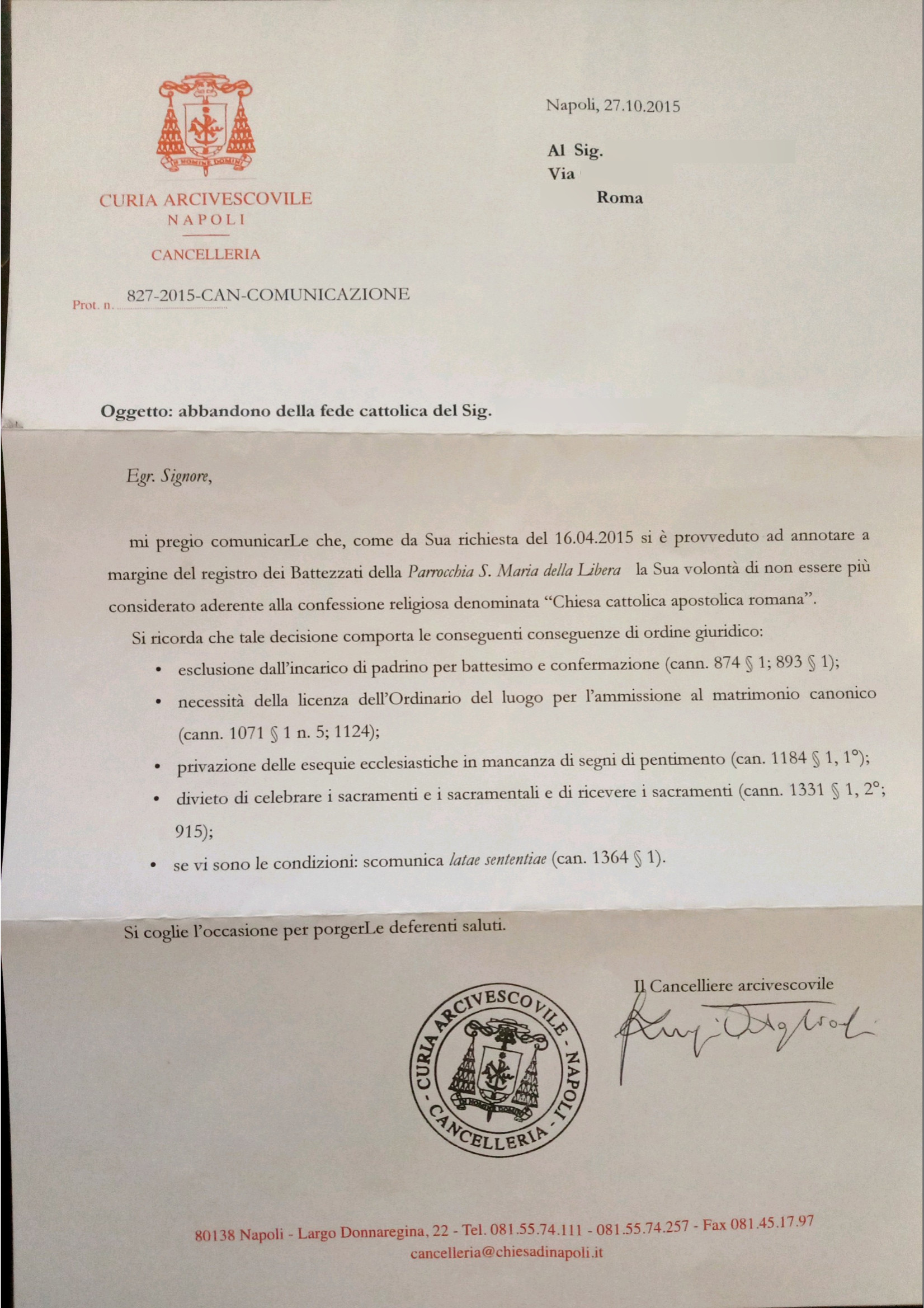 Una persona ha chiesto la rettifica dei dati relativi al proprio battesimo avvenuto a S. Maria della Libera - NAPOLI (NA) il 27/10/2015, dichiarando di non voler più far parte della Chiesa Cattolica.