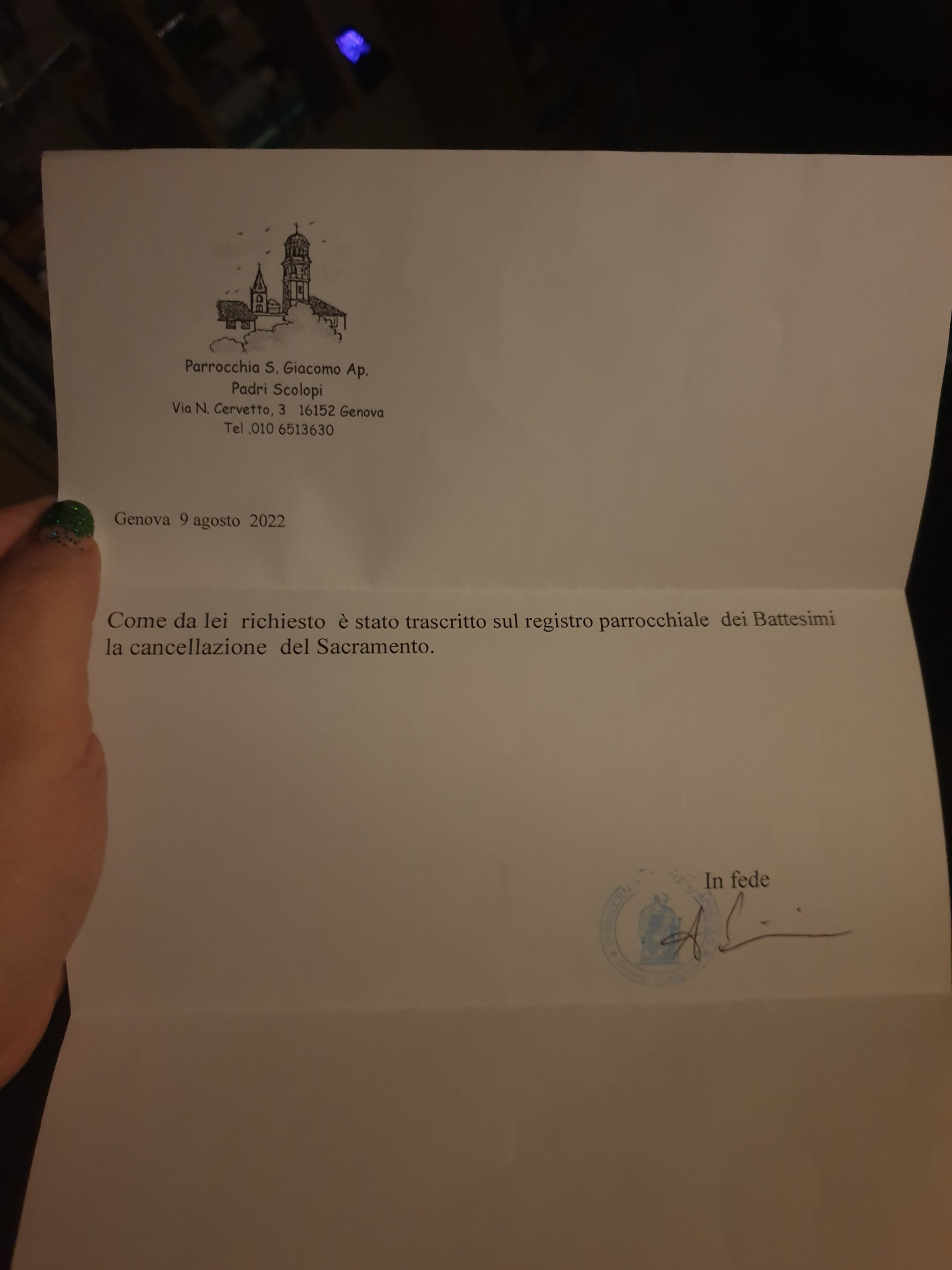Una persona ha chiesto la rettifica dei dati relativi al proprio battesimo avvenuto a S. Giacomo Apostolo - GENOVA (GE) il 09/08/2022, dichiarando di non voler più far parte della Chiesa Cattolica.