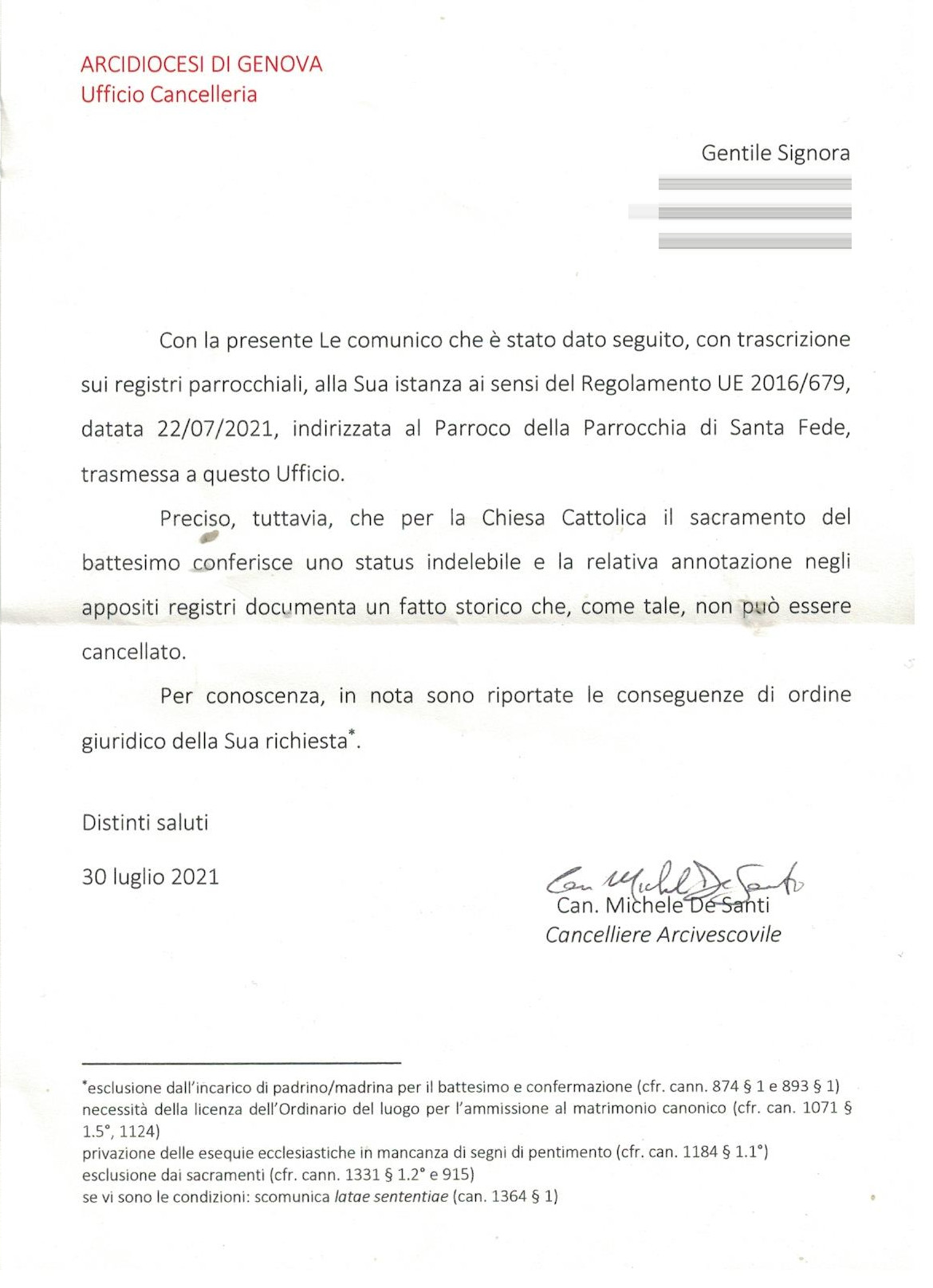 Una persona ha chiesto la rettifica dei dati relativi al proprio battesimo avvenuto a Maria Ss. della Misericordia e S. Fede - GENOVA (GE) il 05/08/2021, dichiarando di non voler più far parte della Chiesa Cattolica.