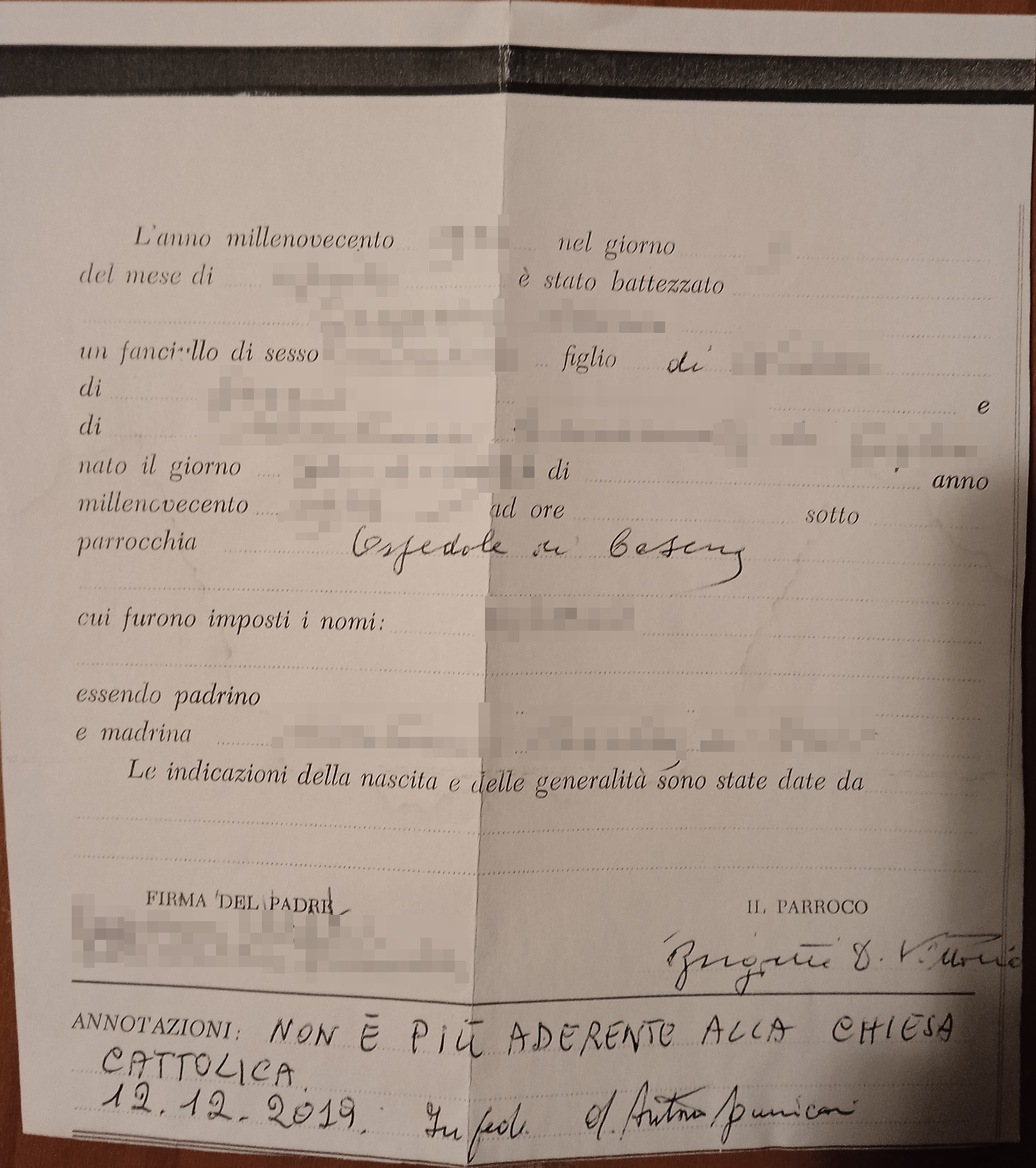 Una persona ha chiesto la rettifica dei dati relativi al proprio battesimo avvenuto a S. Egidio Abate in Gambettola - GAMBETTOLA (FC) il 17/12/2019, dichiarando di non voler più far parte della Chiesa Cattolica.