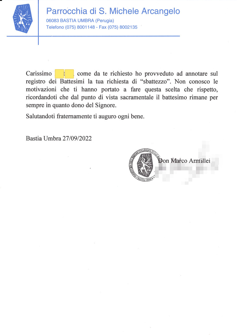 Una persona ha chiesto la rettifica dei dati relativi al proprio battesimo avvenuto a San Michele Arcangelo - BASTIA UMBRA (PG) il 27/09/2022, dichiarando di non voler più far parte della Chiesa Cattolica.