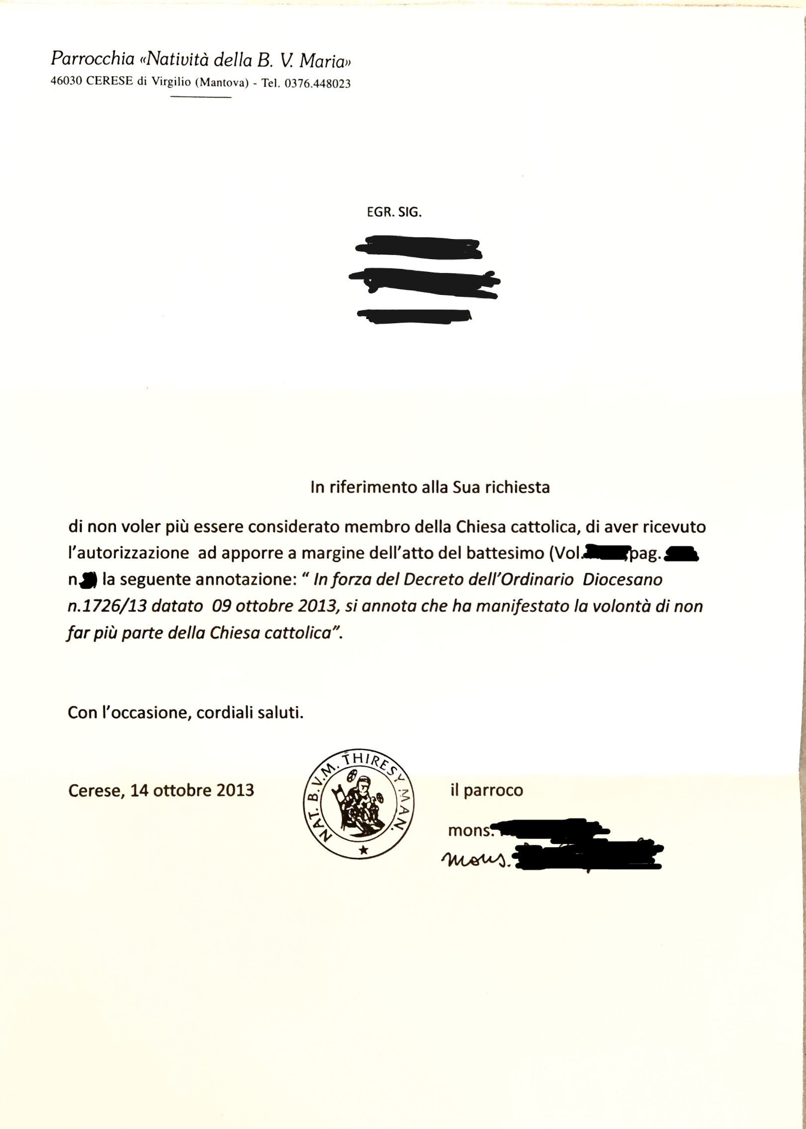 Una persona ha chiesto la rettifica dei dati relativi al proprio battesimo avvenuto a Natività della Beata Vergine Maria - BORGO VIRGILIO (MN) il 14/10/2013, dichiarando di non voler più far parte della Chiesa Cattolica.