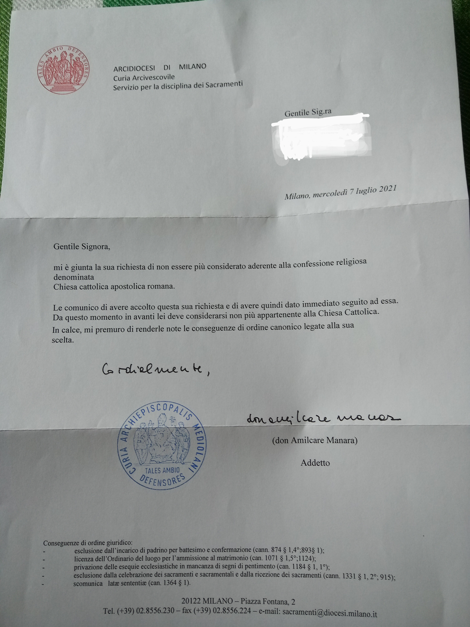 Una persona ha chiesto la rettifica dei dati relativi al proprio battesimo avvenuto a Santa Maria Annunciata - MILANO (MI) il 21/07/2021, dichiarando di non voler più far parte della Chiesa Cattolica.