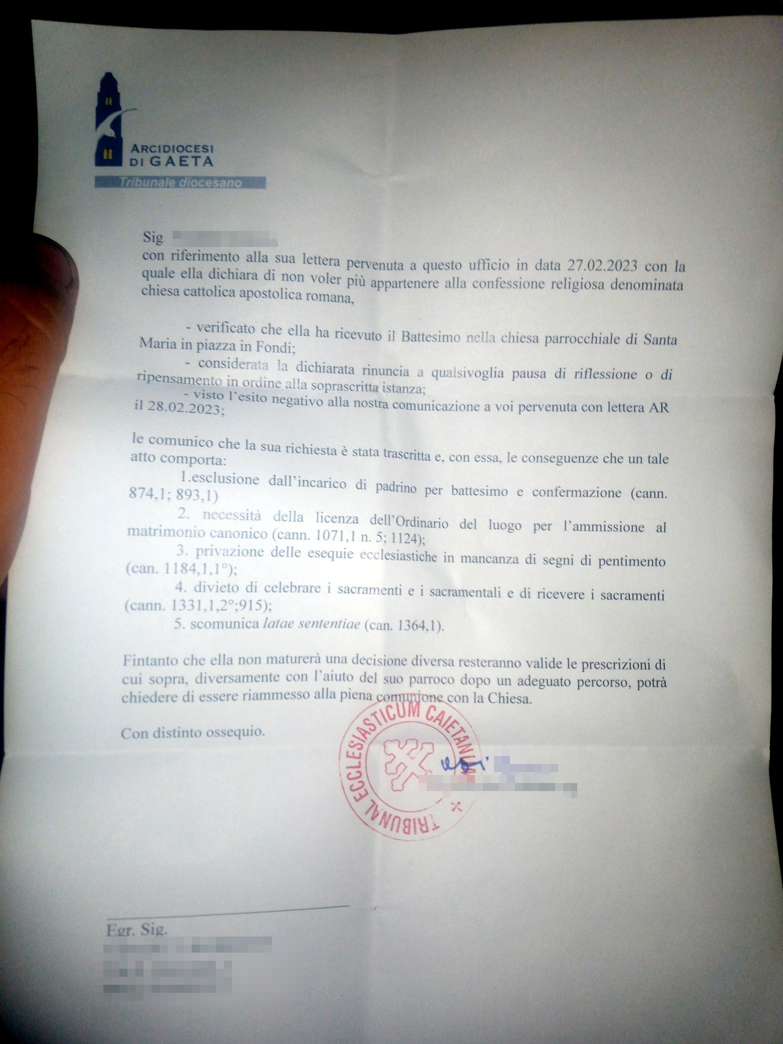 Una persona ha chiesto la rettifica dei dati relativi al proprio battesimo avvenuto a S. Maria in Piazza - FONDI (LT) il 22/03/2023, dichiarando di non voler più far parte della Chiesa Cattolica.