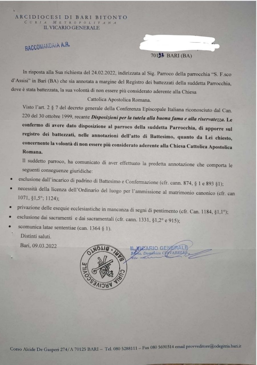 Una persona ha chiesto la rettifica dei dati relativi al proprio battesimo avvenuto a S. Francesco d'Assisi - BARI (BA) il 15/03/2022, dichiarando di non voler più far parte della Chiesa Cattolica.