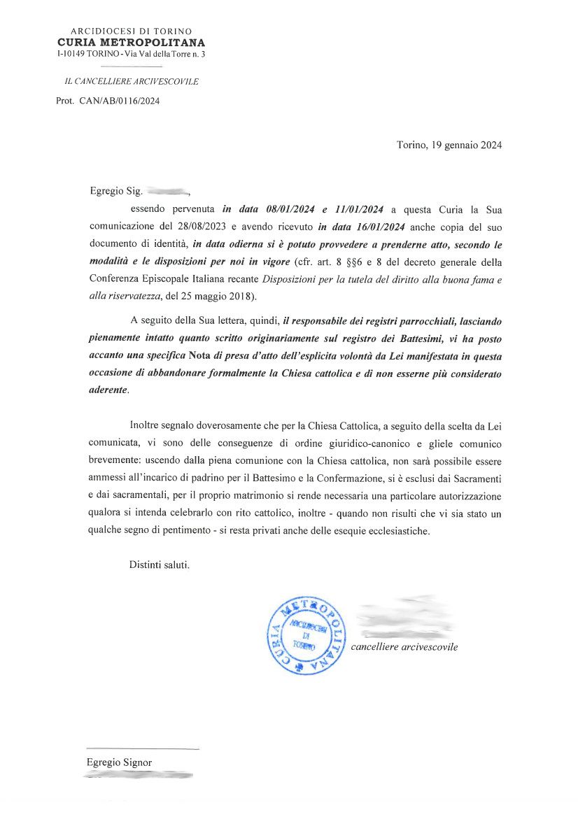Sono finalmente libero da ogni collegamento con la chiesa cattolica, che non può più parlare a nome mio! W la libertà e lo Stato Laico!