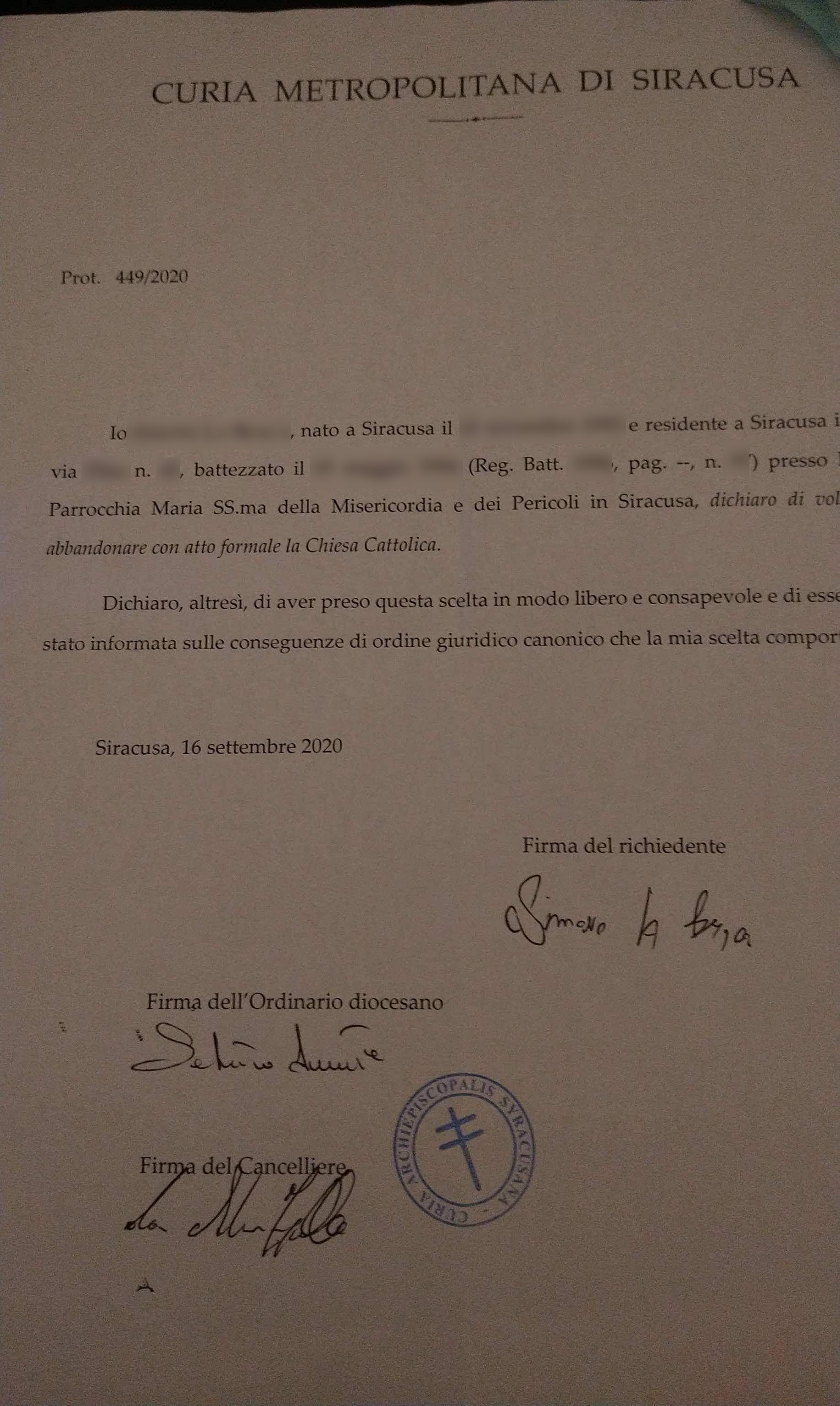 Una persona ha chiesto la rettifica dei dati relativi al proprio battesimo avvenuto a Maria Ss.ma della Misericordia e dei Pericoli - SIRACUSA (SR) il 16/09/2020, dichiarando di non voler più far parte della Chiesa Cattolica.