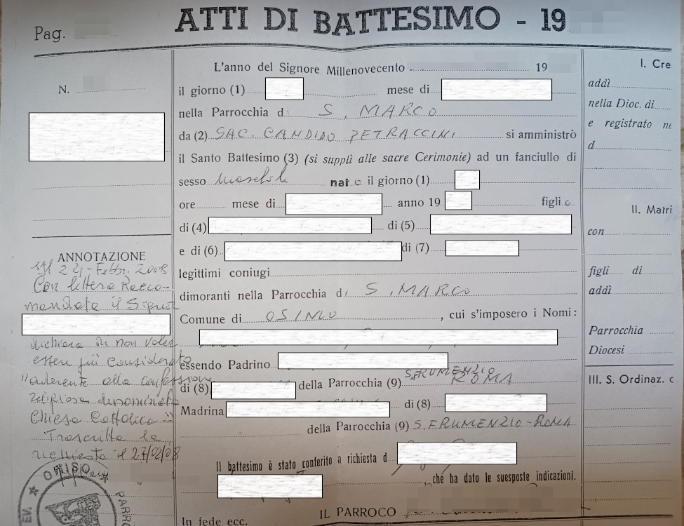 Una persona ha chiesto la rettifica dei dati relativi al proprio battesimo avvenuto a S. Marco Evangelista - OSIMO (AN) il 04/03/2008, dichiarando di non voler più far parte della Chiesa Cattolica.
