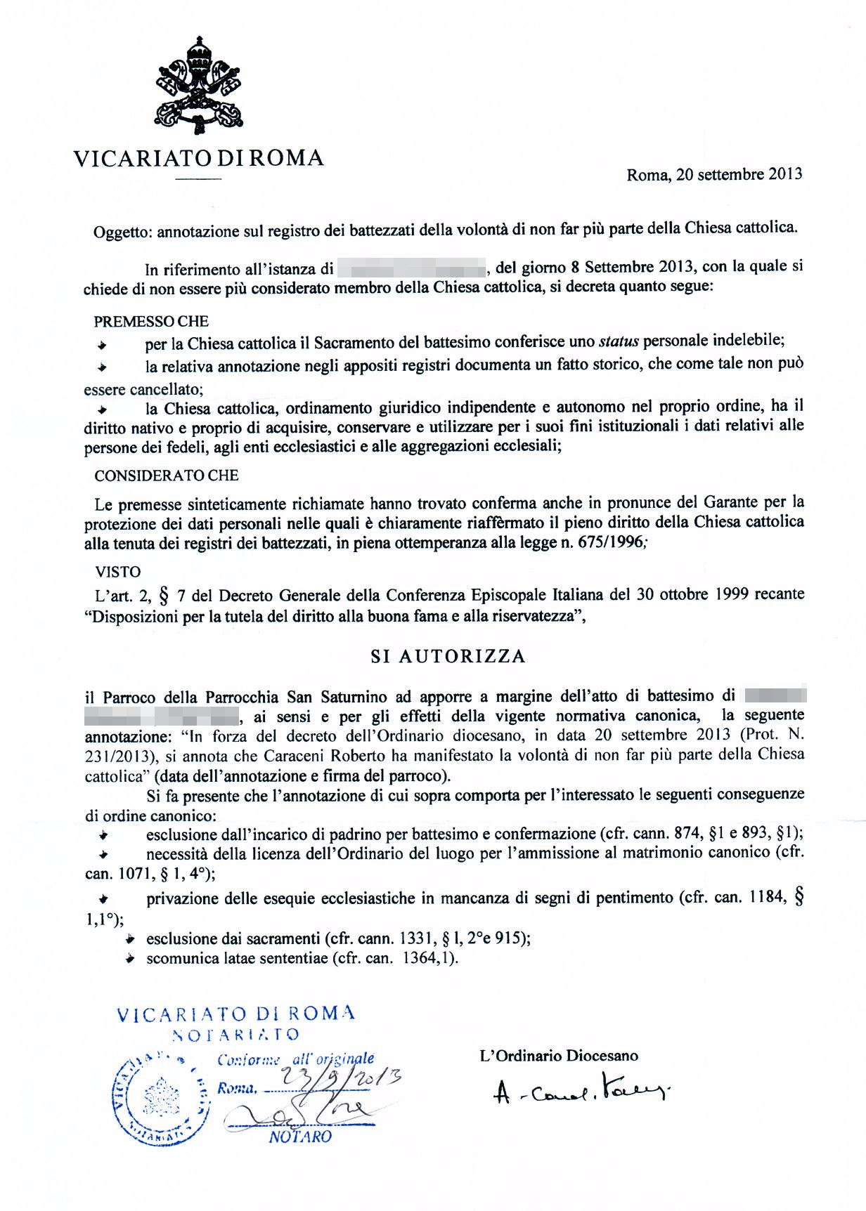 Una persona ha chiesto la rettifica dei dati relativi al proprio battesimo avvenuto a S. Saturnino - ROMA (RM) il 20/09/2013, dichiarando di non voler più far parte della Chiesa Cattolica.