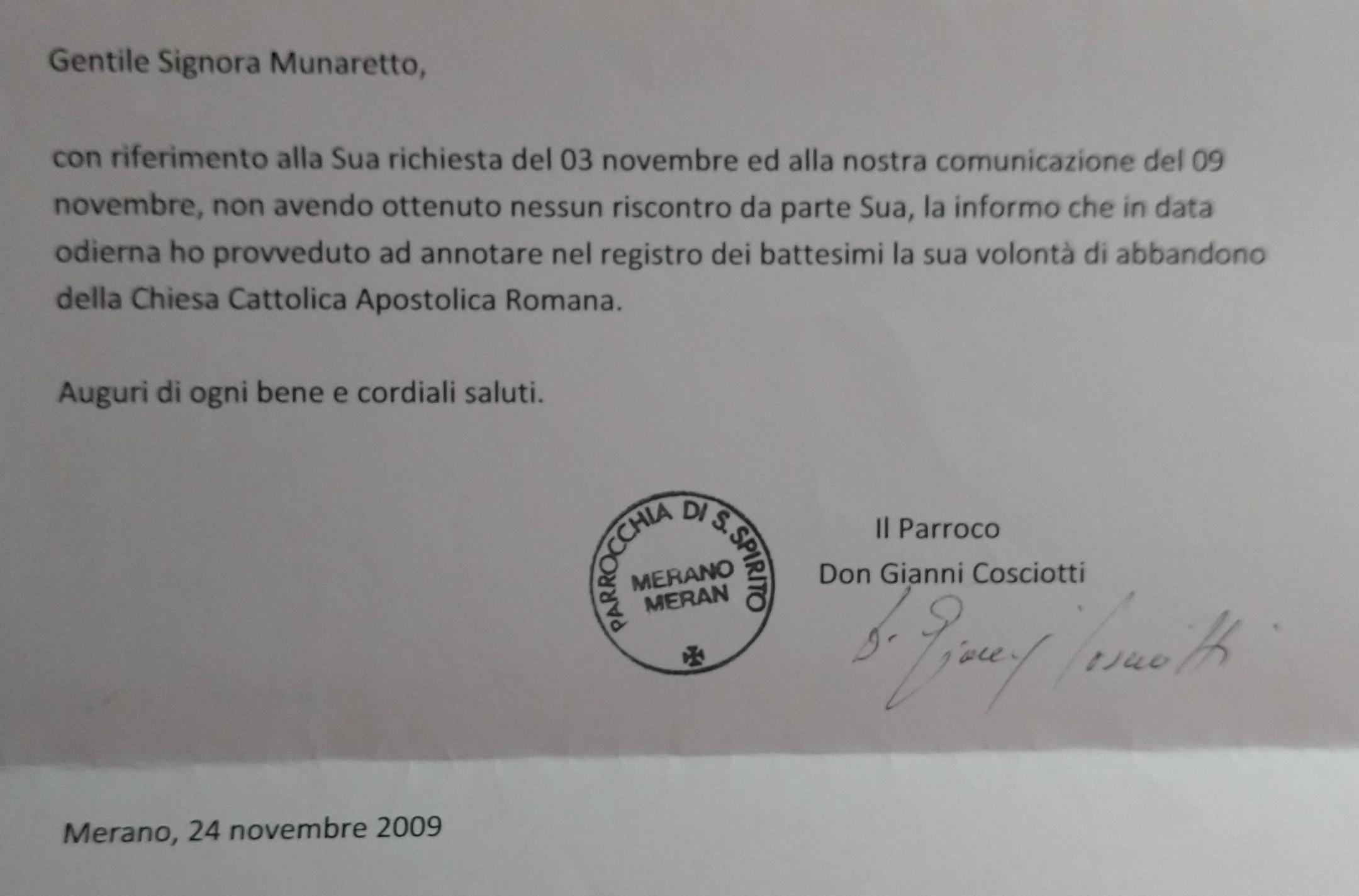 Una persona ha chiesto la rettifica dei dati relativi al proprio battesimo avvenuto a S. Spirito - MERANO (BZ) il 24/11/2009, dichiarando di non voler più far parte della Chiesa Cattolica.