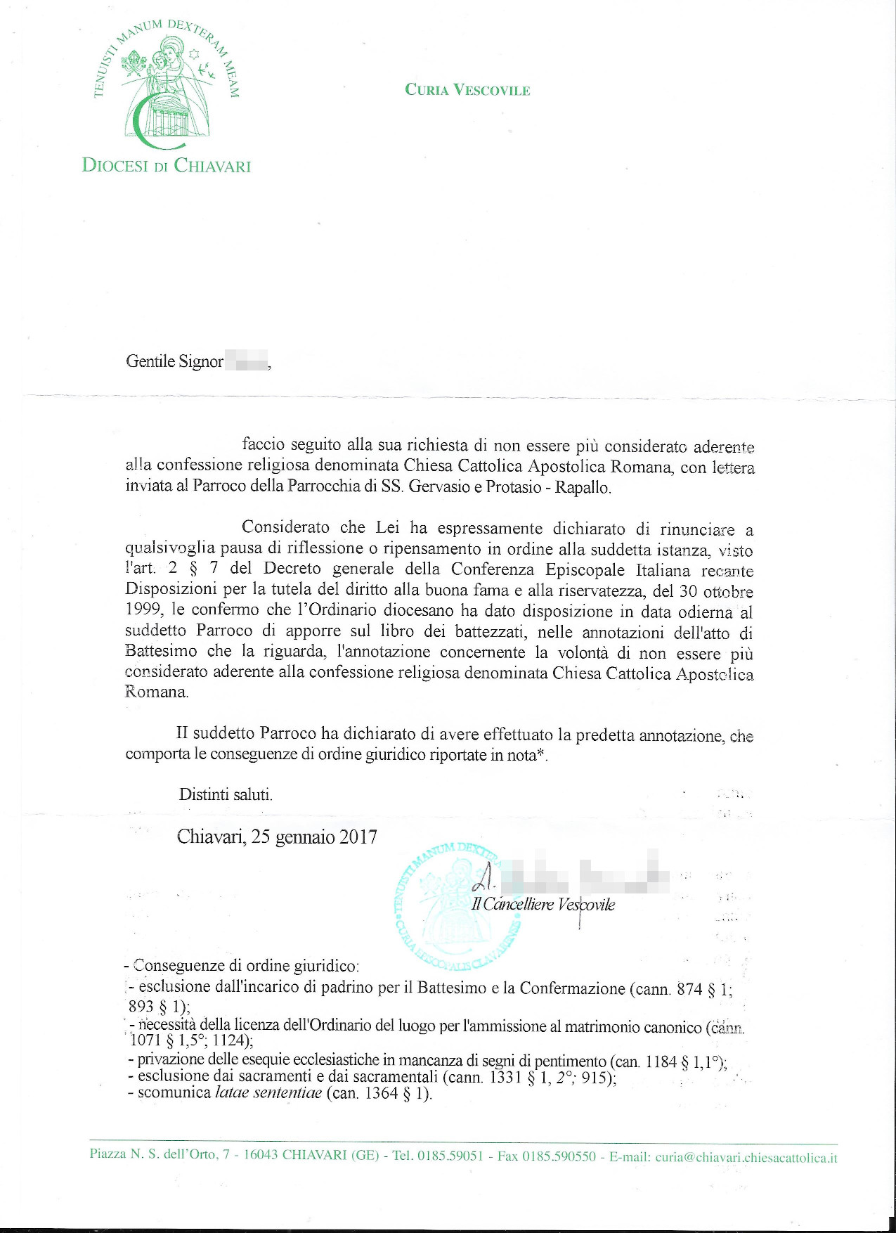 Una persona ha chiesto la rettifica dei dati relativi al proprio battesimo avvenuto a Santi Gervasio e Protasio - RAPALLO (GE) il 27/01/2017, dichiarando di non voler più far parte della Chiesa Cattolica.