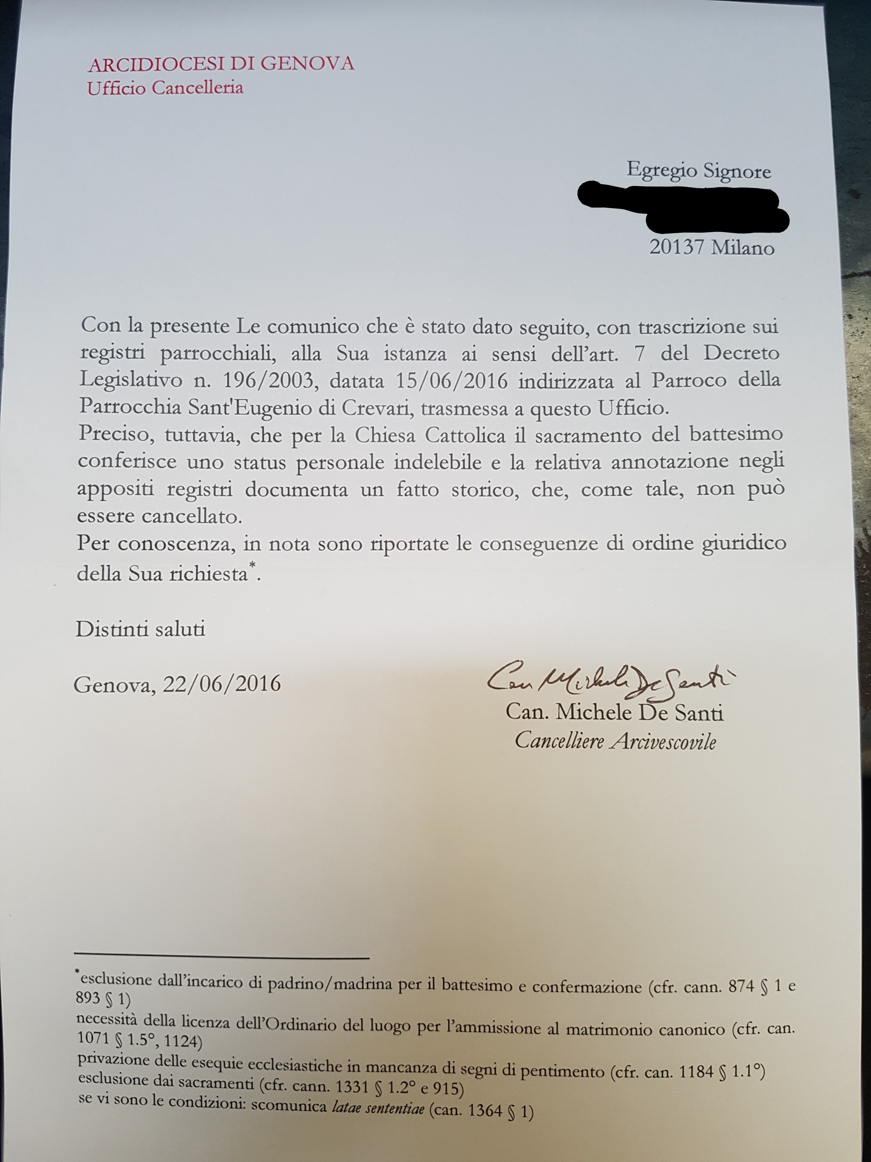 Una persona ha chiesto la rettifica dei dati relativi al proprio battesimo avvenuto a S. Eugenio in Crevari - GENOVA (GE) il 22/06/2016, dichiarando di non voler più far parte della Chiesa Cattolica.